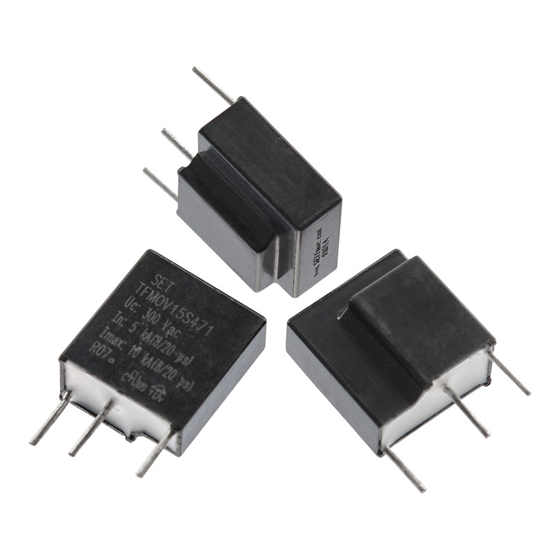Thermally Protected Varistors - Mechanically Off Type Thermally Protected Varistors (TFMOV) are thermally protected varistors. TFMOVs have all the characteristics of a thermally protected varistor (MOV), but are also thermally protected. there are two types of deterioration of MOVs: natural deterioration due to long term operation, and deterioration due to an abnormal surge. When a surge occurs, the leakage current of the degraded MOV increases continuously, causing the surface temperature of the MOV to rise continuously and the possibility of fire. At this time, the heat of the MOV in TFMOV is conducted to the cryogenic alloy solder joint, which senses the abnormal temperature and acts (fuses), driving the spring slider to cut off the circuit, disconnecting the MOV from the main circuit and thus protecting the entire circuit, as well as the MOV itself will not continue to heat up, and the phenomenon of catching fire. Thermal protection type varistor-mechanical release type (TFMOV) is widely used in over-voltage protection of new energy equipments and communication equipments. They play a great role in the absorption of abnormal voltage and lightning surge. SETsafe | SETfuse companies Thermally Protected Varistors (TFMOV) are mainly composed of varistors (MOV), mechanical disconnectors, flame retardant cases and metal components. Nominal Discharge Current: (5 ~ 20) kA; Maximum Continuous Operating Voltage: (17 ~ 750) VAC; Maximum Continuous Operating DC Voltage: (500 ~ 1000) VDC; Safety Approvals: UL, cUL, TUV, CE; Complies with RoHS, REACH requirements.