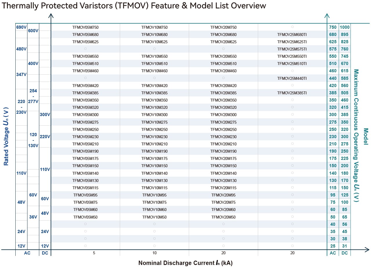 Thermal Fuse Varistor (TFV) is a varistor that incorporates thermal protection. This product possesses all the features of a standard MOV while offering additional thermal safeguards. In cases where an MOV becomes degraded due to long-term operation or abnormal surges, the leakage current of the MOV continues to increase, potentially leading to overheating and even fire. The thermal fuse, consisting of a fusible alloy, within the TFV is highly responsive to abnormal temperatures and triggers an action to disconnect the circuit, thereby preventing the MOV from overheating or catching fire. Thermal Fuse Varistors (TFV) finds wide application in various fields such as power supplies, industrial equipment, and communication devices that demand high reliability and weather resistance. SETsafe | SETfuse provides Thermal Fuse Varistors (TFV) with maximum peak current ratings ranging from 5 kA to 10 kA, and maximum continuous voltage ratings from 50 VAC to 510 VAC. These TFVs are equipped with safety certifications such as UL, cUL, TUV, and CQC, and comply with the requirements of RoHS and REACH.