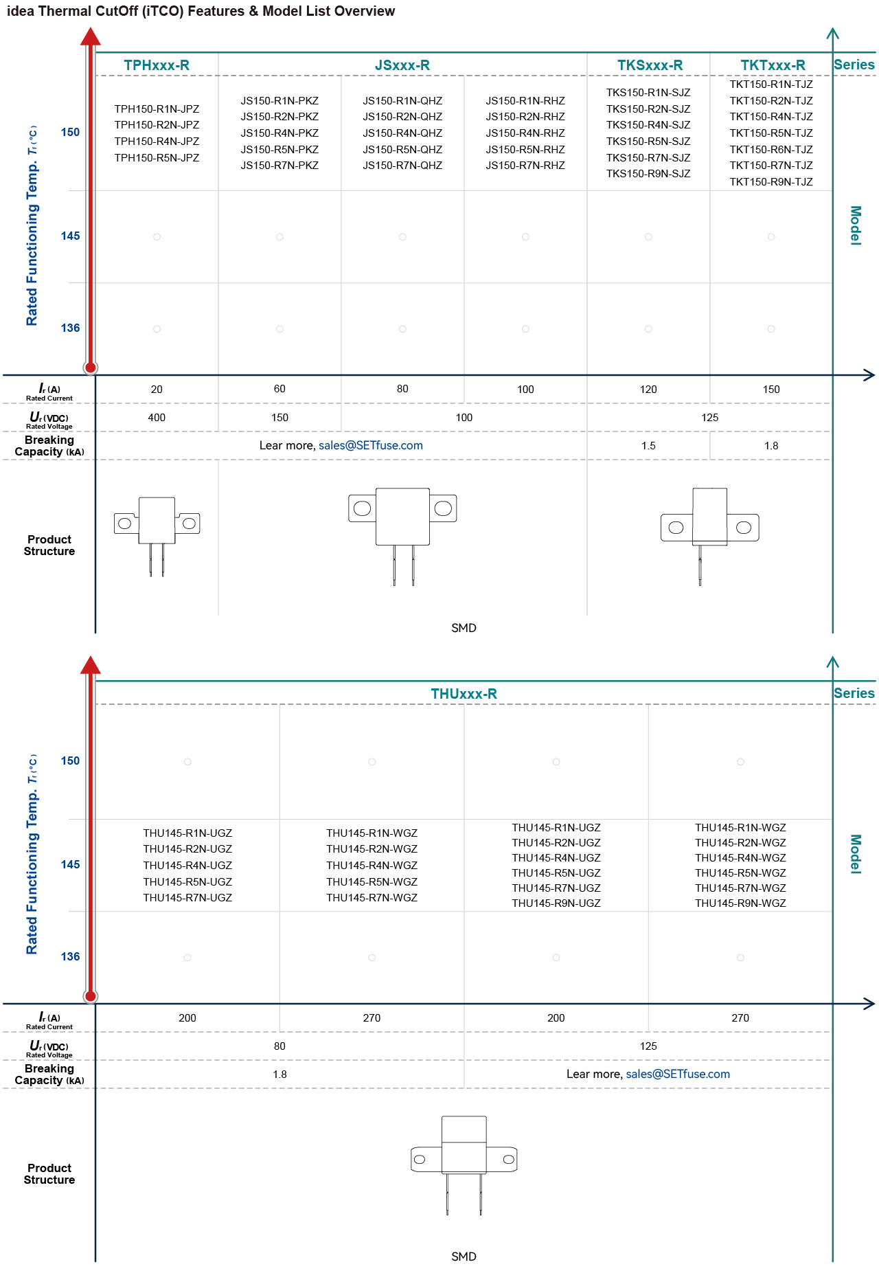 idea Thermal CutOff (iTCO) is a fuse that uses low melting point alloys as the electrical connection point of the main circuit, with built-in heater as the control circuit, to achieve controlled fusing function. idea Thermal CutOff (iTCO) is consist mainly of Thermal Element, Electrode, Flux Resin, Feed Heater, Alloy Thermal-Link and Lead wire, sealed in plastic or ceramic housings. idea Thermal CutOff (iTCO) is mainly used in the protection of new energy security, and secondary protection for charging and discharge circuits. idea Thermal CutOff (iTCO) mainly uses two electrodes which are connected with the thermal element of the fusing elements as electrical connections with passive temperature-sensing fusing actions. At the same time, Built-in heater with independent over-temperature protection heats the thermal element, provides sufficient heat to the fuse, cuts off the main circuit and disconnects the control circuit to achieve self-protection. SETsafe | SETfuse idea Thermal CutOff (iTCO) covers Rated Current from 20 to 270 A, Rated Voltage from 80 to 500 VDC, Rated Functioning Temp. 136 to 150 °C, with UL, cUL, TUV Approvals and RoHS, REACH compliant.